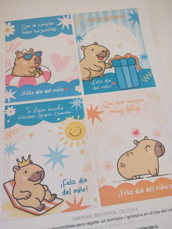 - 4 diseños distintos en la misma hoja - con espacio para que pegues un bombón, caramelo, golosina pequeña